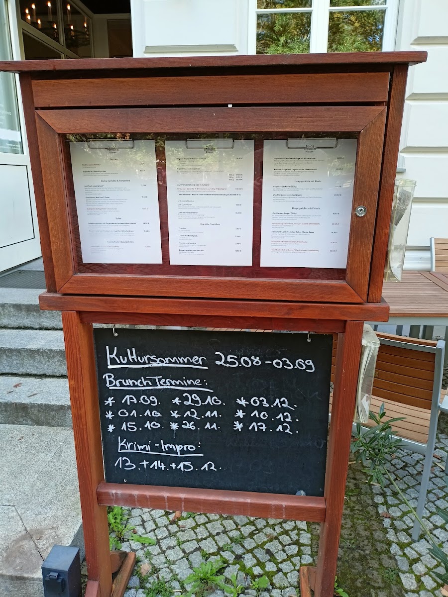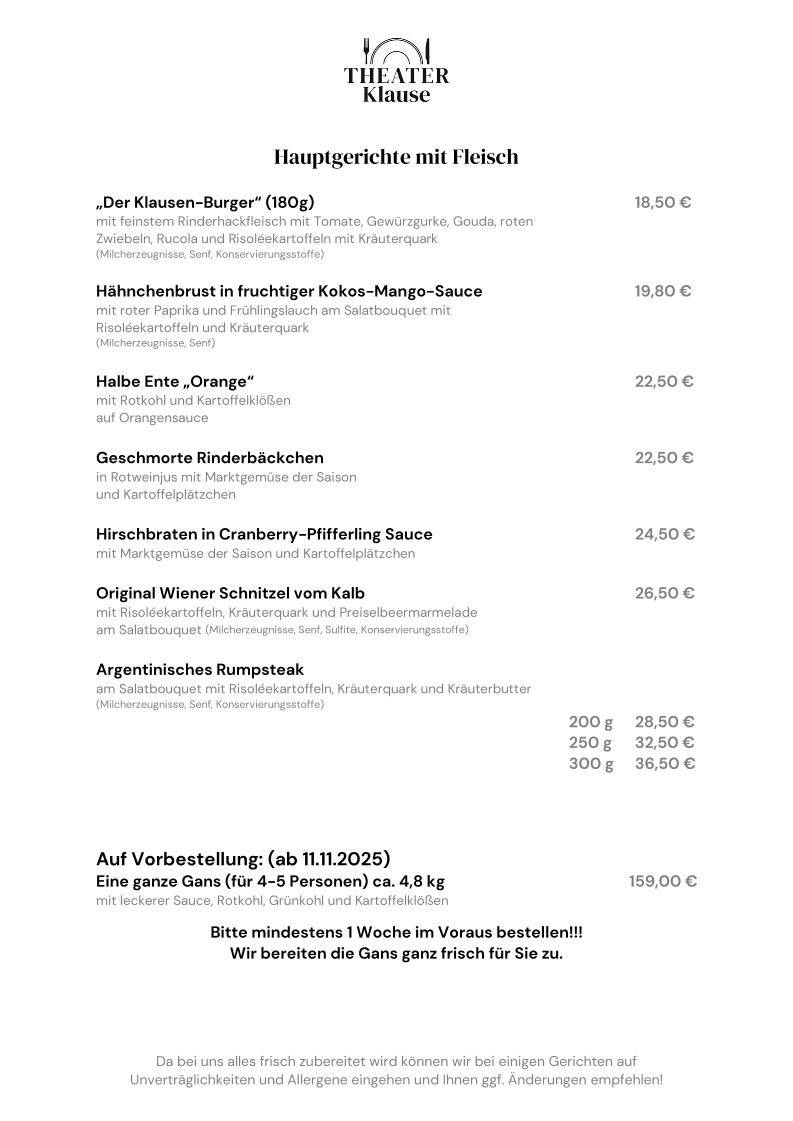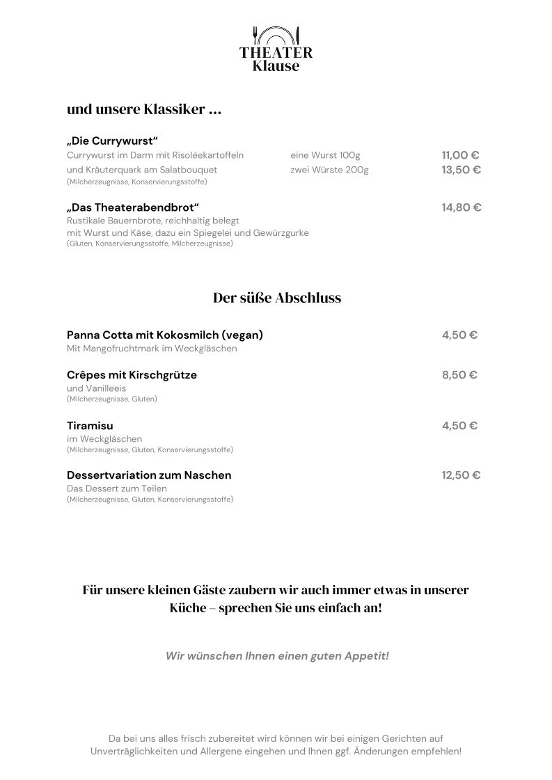 Fish lovers can choose between refined preparations such as Gegrilltes Lachsfilet (200g), Zanderfilet in der Senfschrotkruste, or the more delicate Zanderfilet in Weißweinjus, each suggesting a focus on quality ingredients and classic techniques. Meat-based mains are equally diverse and satisfying, from the hearty “Der Klausen-Burger” (180g) and Hähnchenbrust in fruchtiger Kokos-Mango-Sauce to traditional and game-focused dishes like Halbe Ente “Orange”, Geschmorte Rinderbäckchen, and Hirschbraten in Cranberry-Pfifferling Sauce. The inclusion of house classics such as “Die Currywurst” and “Das Theaterabendbrot” reinforces the restaurant’s regional roots. To finish, desserts like Panna Cotta mit Kokosmilch (vegan), Crêpes mit Kirschgrütze, Tiramisu, and the Dessertvariation zum Naschen provide a sweet and satisfying conclusion. Overall, the menu feels thoughtfully composed, offering something for every palate while maintaining a clear and confident culinary identity.