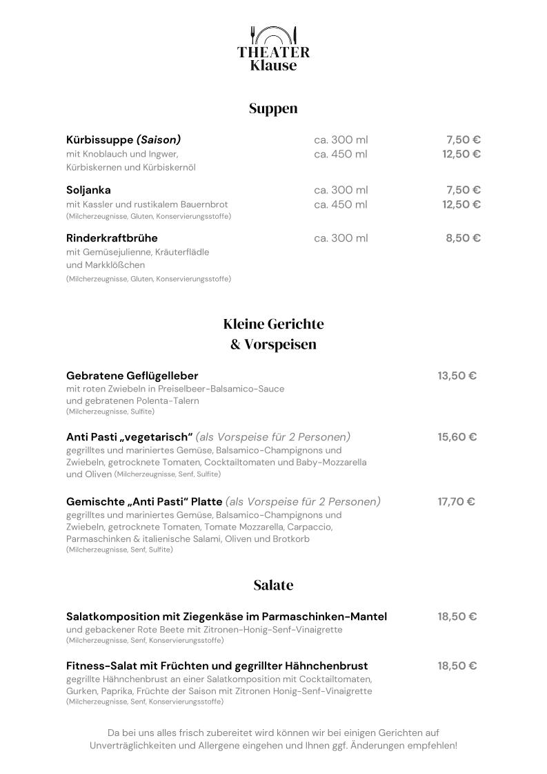 From a reviewer’s perspective, the menu at Restaurant Theaterklause feels like a well-curated culinary journey that balances tradition, creativity, and inclusivity. It begins comfortably with soups such as Kürbissuppe (Saison), Soljanka, and Rinderkraftbrühe, setting a warm and familiar tone. The selection of small dishes and starters, including Gebratene Geflügelleber, Anti Pasti “vegetarisch” (als Vorspeise für 2 Personen), and the Gemischte “Anti Pasti” Platte (als Vorspeise für 2 Personen), works perfectly for sharing and highlights the kitchen’s attention to both vegetarian and mixed tastes.